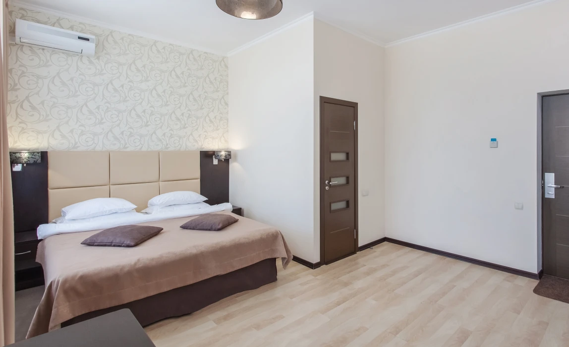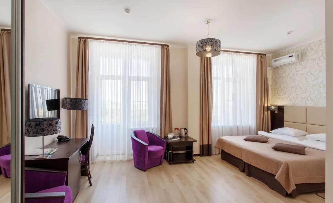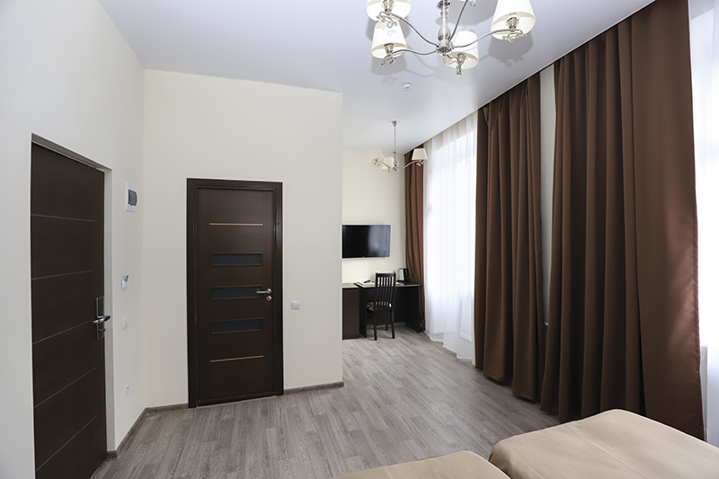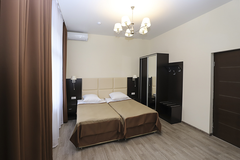 Площадь номера - 16-23 кв.м. 2 осн. места. 1 доп. место. Балкон. Мебель: вешалка, зеркало, кровати односпальные /одна двуспальная кровать, прикроватные тумбочки, стол, стул, шкаф. Оборудование: гладильная доска, кондиционер, мини-холодильник, набор посуды, сейф, телевизор ЖК, телефон, утюг, электрочайник. Санузел: с душем, тапочки, туалетные принадлежности, фен. Сервис: Wi-Fi бесплатно, смена полотенец, смена постельного белья, уборка номера.
