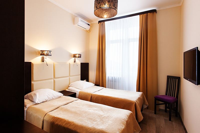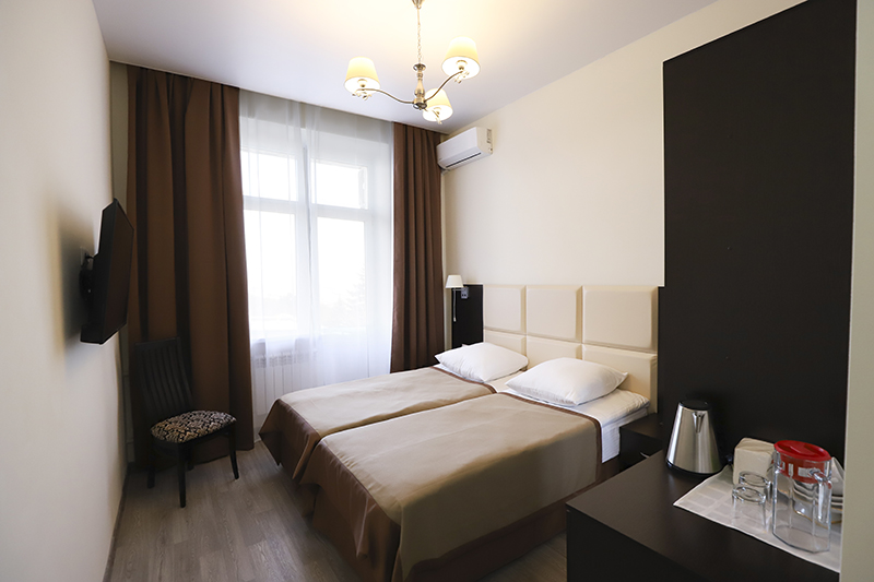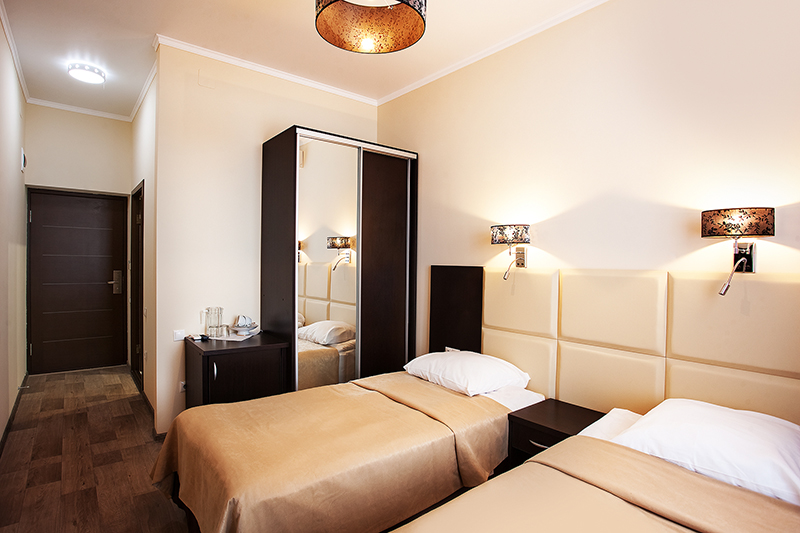 Площадь номера - 16 кв.м. 2 осн. места. Балкон. Мебель: вешалка, зеркало, кровати односпальные /одна двуспальная кровать, прикроватные тумбочки, стул, тумба, шкаф. Оборудование: кондиционер, мини-холодильник, набор посуды, телевизор ЖК. Санузел: с душем, туалетные принадлежности, фен. Сервис: Wi-Fi бесплатно, смена полотенец, смена постельного белья, уборка номера.